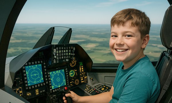 In einem realistischen Simulator können Kinder selbst das Steuer übernehmen und spielerisch erleben, wie es ist, ein Flugzeug zu fliegen.